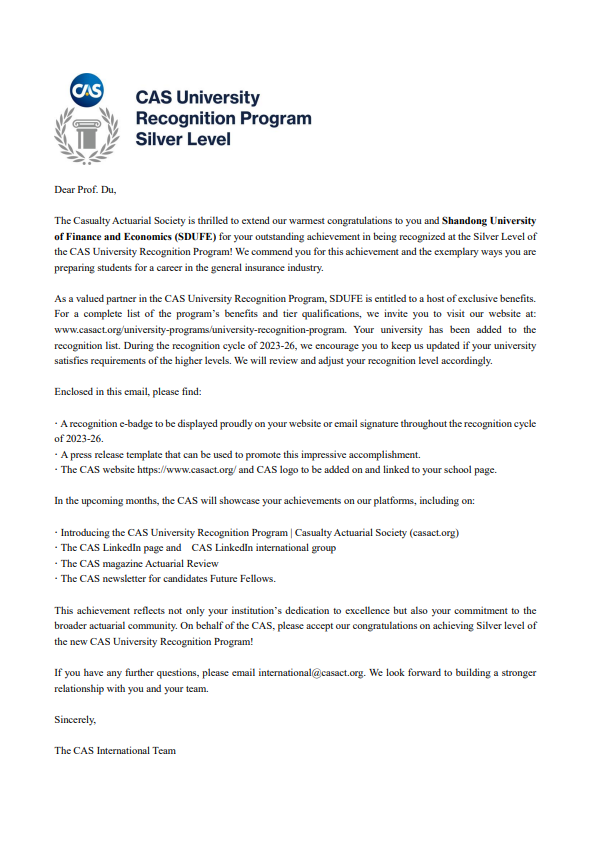 3月14日,北美产险精算师协会(Casualty Actuarial Society,CAS)致函我校,确认小黄书 精算项目已通过其高校认证项目(University Recognition Program)的严格审核并荣获“Silver Partner”认证。这标志着我校成为中国大陆首批获此殊荣的三所高校之一,彰显了我校在精算教育领域的卓越实力。截至目前,全球共有47所高校通过CAS的高校认证项目,中国大陆仅三所高校,分别为小黄书 、湖南大学和中央财经大学,获得认证的高校将在精算教育和研究方面得到CAS提供的特别资助。