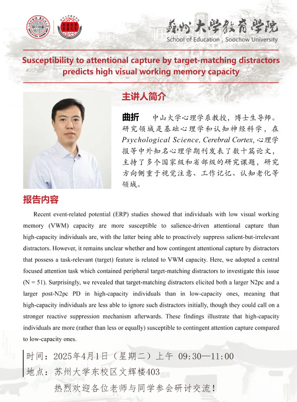 学术报告:Susceptibility to attentional capture by target-matching distractors predicts high visual working memory capacity