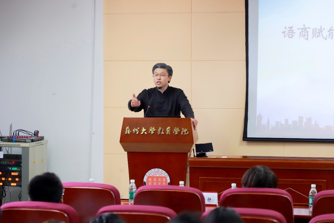 随后,李易真从“个人成长、社会担当、家国情怀”三个维度与青年学生对话,以精彩的人生经历和丰富的案例生动剖析了语商如何为学习赋能。他特别强调了“九商共赢”理论,即智商、逆商、语商、健商、美商、财商、灵商、情商和德商。他指出,语商在青年发展中具有重要作用,鼓励青年锤炼表达力、表现力和表演力,更好地担当青春使命。在互动环节中,同学们踊跃提问,李易真结合职场交际、社会实践等场景,通过趣味互动和真实案例,向同学们传授了提升语言逻辑性、感染力及跨场景沟通的实用方法,帮助大家深化了对语商核心价值的认知。