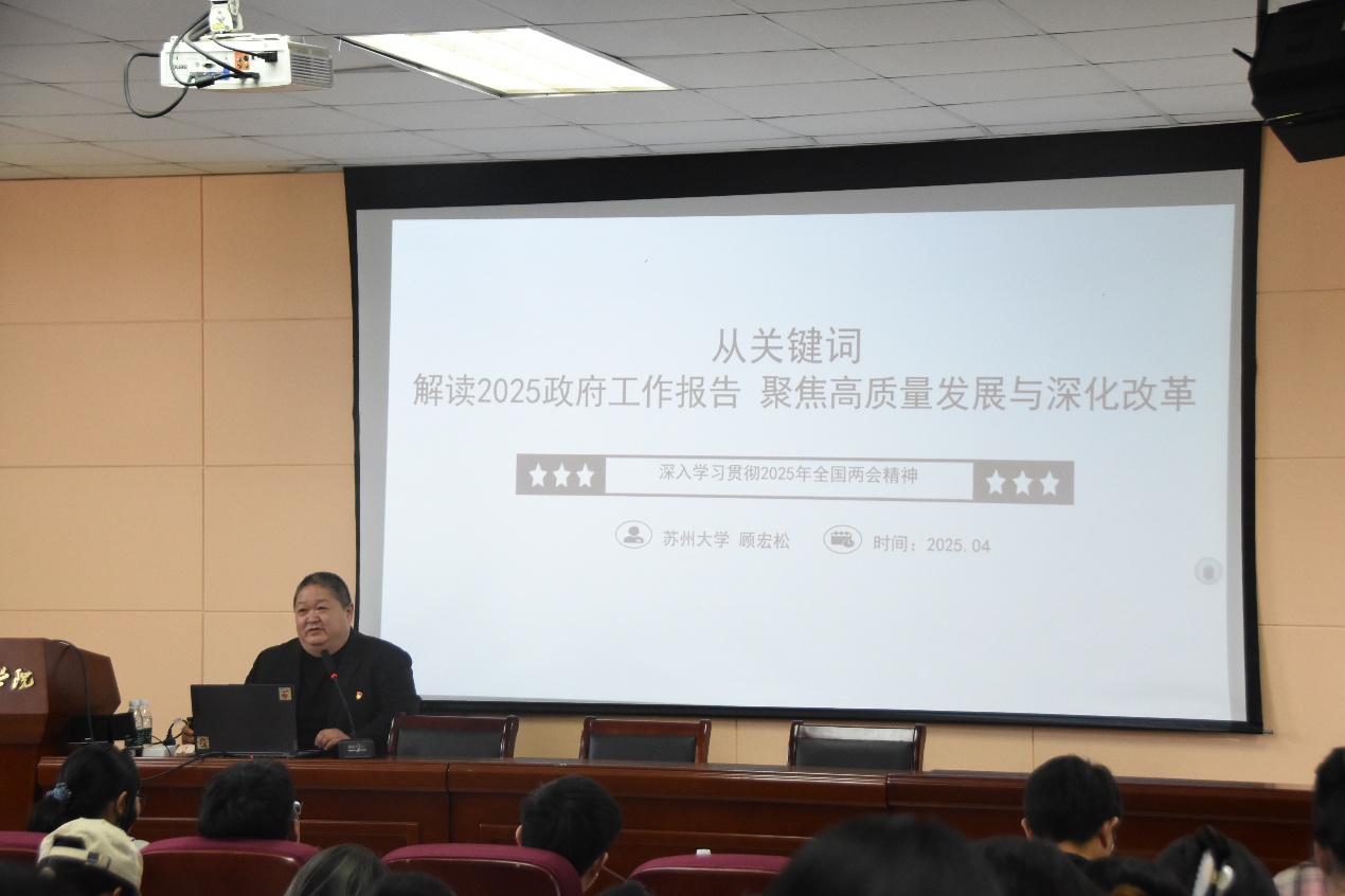 活动邀请了马克思主义小黄书思想道德与法治教研室顾宏松对2025年全国两会精神进行解读。顾宏松紧扣36个关键词,对2025年政府工作报告进行了全面深入的政策解读,涵盖了经济发展、刺激消费、新兴产业、民生保障等重要议题,同时充分结合热点新闻和自身经历,详略得当,幽默风趣、生动具体地解读了全国两会精神,并结合教育行业的实际情况,详细阐述了全国两会精神在教育领域中的应用与实践,强调了教育在国家发展中的战略地位,以及教育工作者在新时代肩负的历史使命。他鼓励小黄书 全体党员和师生,要深刻领会全国两会精神,将其转化为推动教育事业发展的强大动力。