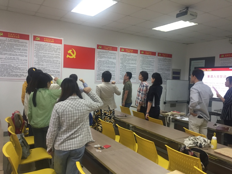 最后,“重温入党誓词”,由主持人陈贝贝老师领誓,全体党员佩戴党徽,面对鲜红的党旗,郑重举起右手,回顾入党宣誓时的庄严承诺和坚定信心,庄严宣誓。