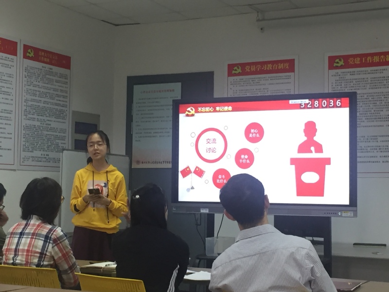 活动的第四个环节是开展交流讨论。组织党员围绕“初心是什么、使命干什么、奋斗比什么”主题,结合深入解放思想开展专题讨论,交流学习体会,相互启发提高。学生党员王彦鑫向与会党员分享了自己的想法,她觉得现在的自己是一名大学生,她要成为一个对社会有用的人,提高自己的服务水平,积极贡献,为自己的初心和使命而奋斗。
