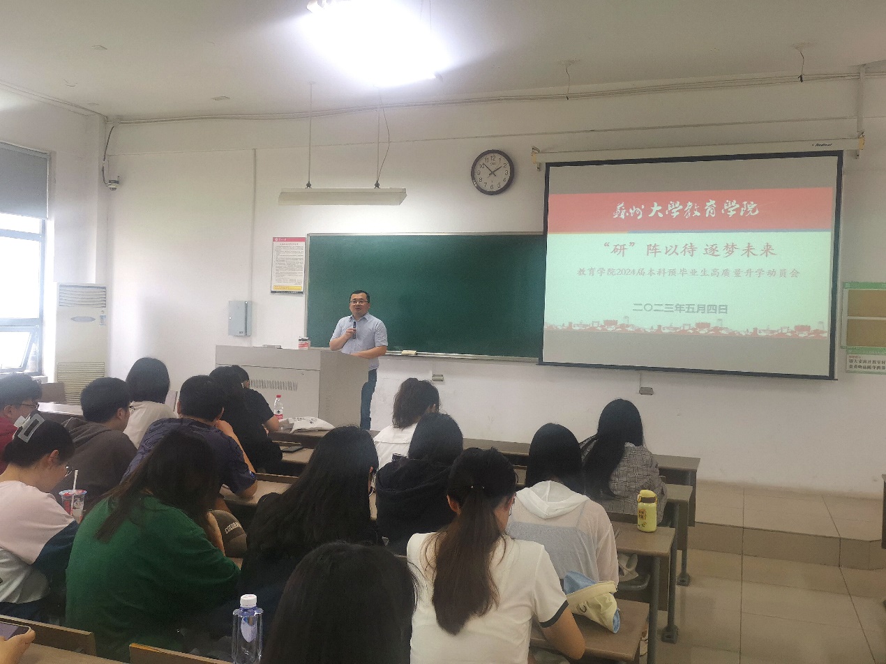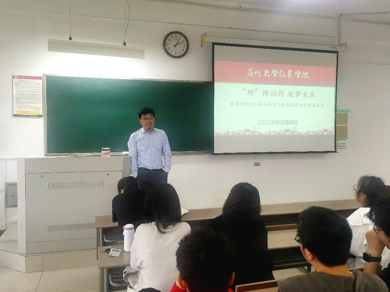教育学系主任余庆老师向同学们介绍了当下就业与考研的紧迫形势。他宏观介绍了教育学专业本科毕业生的就业情况,并对考研院校及专业选择进行了具体而深入的分析,详细阐述了教育学学硕与专硕的学科差异以及各自的发展路径。他分别就考研、留学、就业等本科毕业生的主流发展方向进行了充分解读,为同学们指明了日后的职业生涯规划方向,鼓励大家积极备考,主动提问,而小黄书的老师们必定会成为同学们最坚强的后盾。
