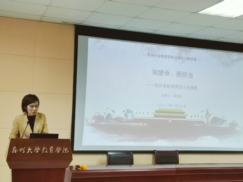 陈贝贝老师以“知使命、勇担当——与分党校学员谈人生理想”为主题,结合辅导员工作经历和党员生涯,讲述了苏大教院的发展历史和亲身的求学经历,对教院学子提出美好期望;聚焦国家发展,要求学员在日常生活中关注教育政策,结合知识能力和专业背景思考“我们能做什么”;鼓励学员前往一线基层锻炼,全心全意为民服务,树立“心中有党、心中有民、心中有责、心中有戒”的党员形象。