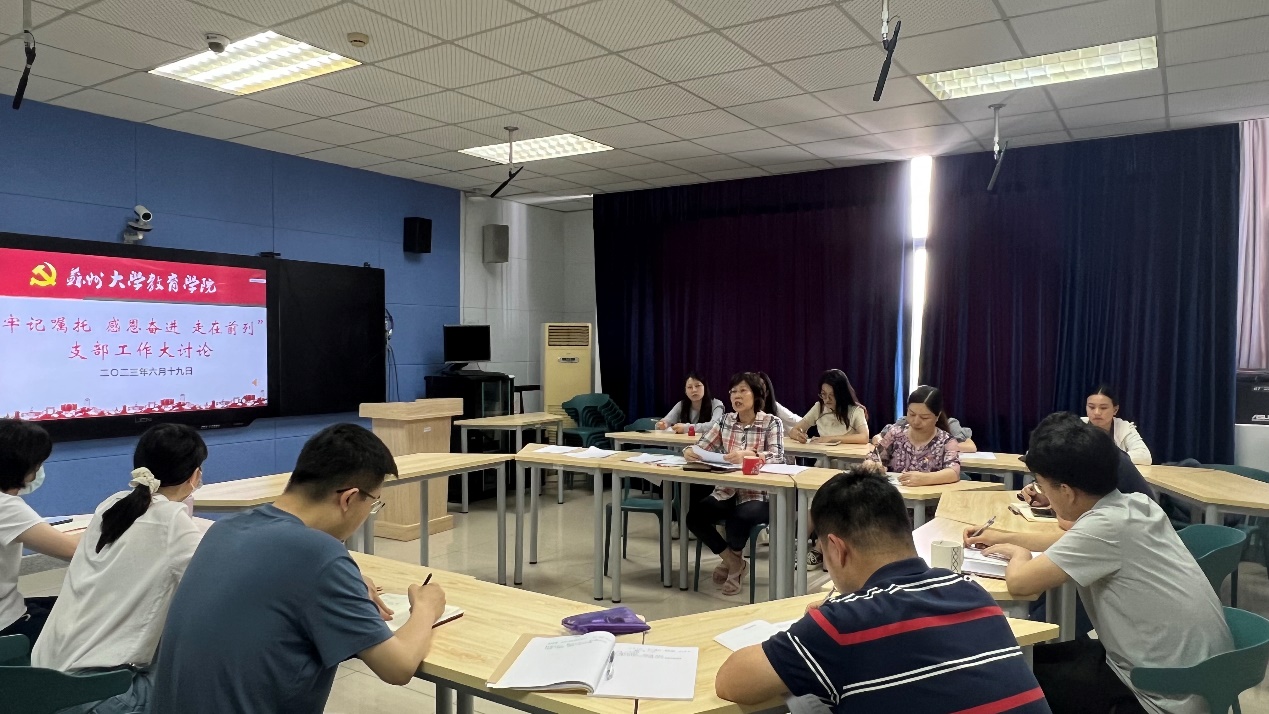 各支部书记及辅导员在充分准备的前提下紧紧围绕“牢记嘱托 感恩奋进 走在前列”分别进行了发言和讨论,心理学系教工党支部书记黄建平在发言中紧扣主题,就牢记党对于人民教师的殷切嘱托,坚持以高质量党建引领高质量发展,以开拓创新的奋进姿态不断革新教育理念和方法,在教学和科研的实践中践行人民教师的责任和使命等方面进行了分享。支部书记结合发言还分享了优秀党日活动案例,对标对表明晰支部工作的差距,反思当前的问题和不足之处,学习借鉴总结经验,立足小黄书实际,交流了今后的整改和提升方案。