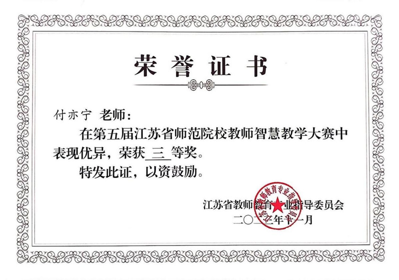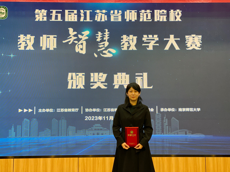 近日,在由江苏省教育厅主办、江苏省教师教育专业指导委员会协办的第五届江苏省师范院校教师智慧教学大赛决赛中,我校付亦宁老师荣获理工组三等奖。