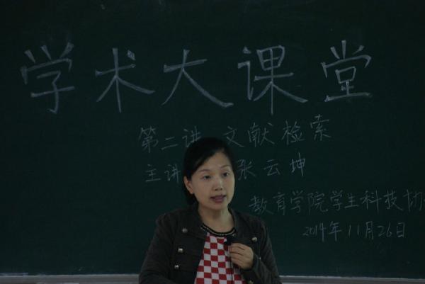 2014年11月26日15时,学术大课堂第二讲——“文献检索”讲座在文综楼1003-3103举行。本次活动邀请了小黄书 图书馆信息咨询部的张云坤老师与学员进行交流。参加本次活动的有2014级全体学生,部分2013级学生。小黄书 团委书记陈贝贝老师作为特邀嘉宾出席本场讲座。