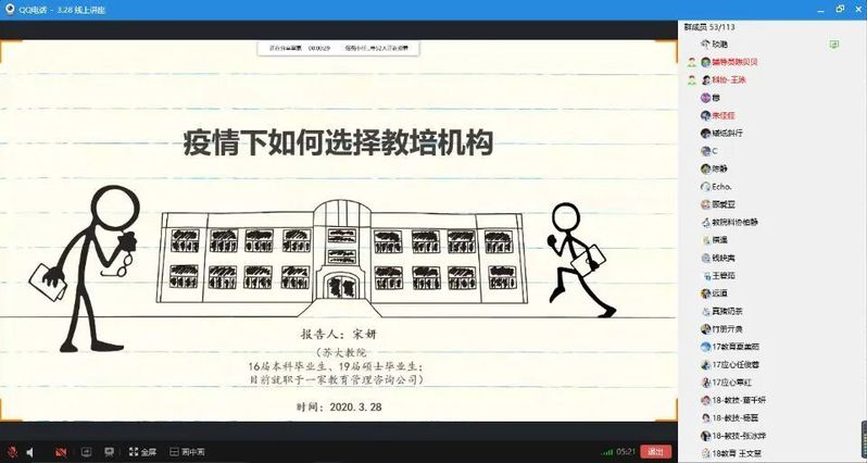 第五场讲座由2019届教育经济与管理硕士毕业生宋妍主讲,她2016年本科毕业于教育学(师范)专业,目前就职于教育咨询公司。宋妍首先从教培机构的定义、产生原因、以及近几年发展概况三个方面介绍了教培机构的基本情况,接着分析了疫情对教培行业的主要影响。她提醒大家现阶段选择教培机构有9个重要的注意点:是否合规、是否长久、教研工作如何、师训工作如何、薪资待遇、工作与休息时间安排、管理是否精细化、创始人动机、选择原则,并逐项解释。