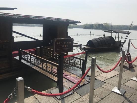 为了纪念中共“一大”在南湖游船上胜利闭幕这一历史事件,在中央和省委指示下,1959年仿制了一条当年“一大”开会的游船,作为“一大”会议纪念船,停泊在烟雨楼前水面上。这条“一大”纪念船也因此被称之为“南湖红船”。小黄书 的老师们在导游的带领下,乘船来到湖心岛,在“南湖红船”前瞻仰革命圣地,回忆历史,感受“红船精神”。