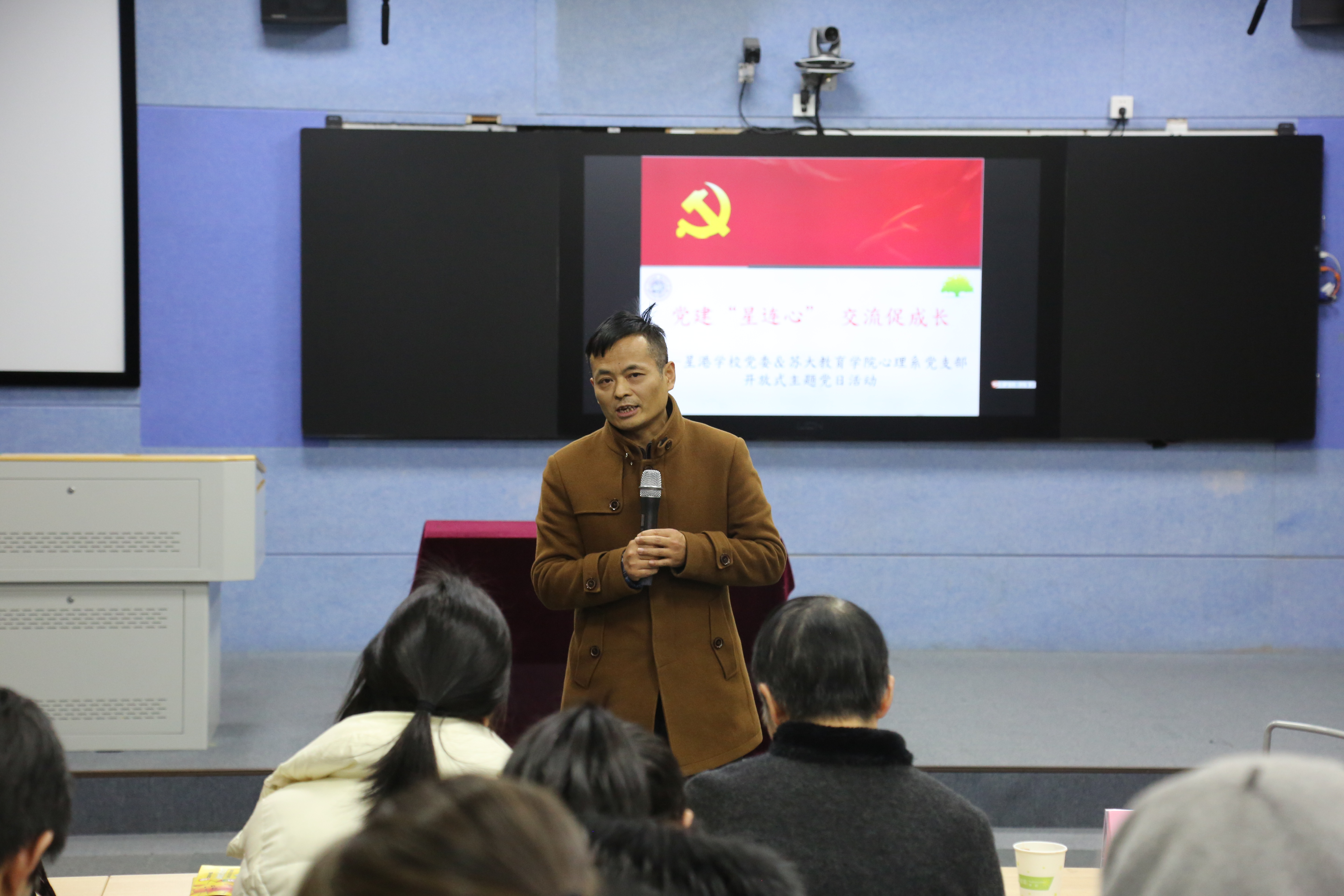 活动最后,身为直接负责联系心理学系党支部的小黄书领导,苏大小黄书 院长冯成志教授介绍了党建工作经验。2018年12月,心理学系党支部成功入选教育部“全国党建工作样板支部”培育创建单位。党建工作扎实有效、活动丰富、深入基层,起到了良好的示范榜样作用。冯院长充分肯定了今天活动的形式和效果,双方共同学习交流,进一步强化了基层党建合力。他表示要将两家单位的党建联盟更加深入、常态化地推进下去。