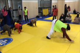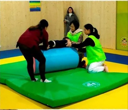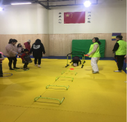 不仅在秩序方面有了提高,孩子们在对教练的示范与观察模仿方面也有了长足的进步,从、二对一,甚至三对一的指导到第四次训练可以初步集体听教练的指令进行团体活动了。此外,每当进行到训练的最后项目——团体游戏时,孩子们总是兴致高昂,老鹰捉小鸡,蛇形爬、大家手拉手一起跳集体舞,场内充满了欢声笑语……