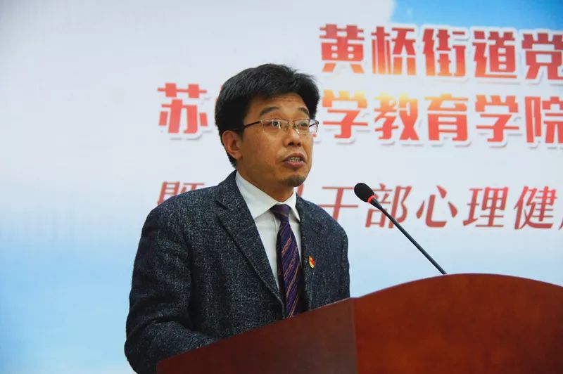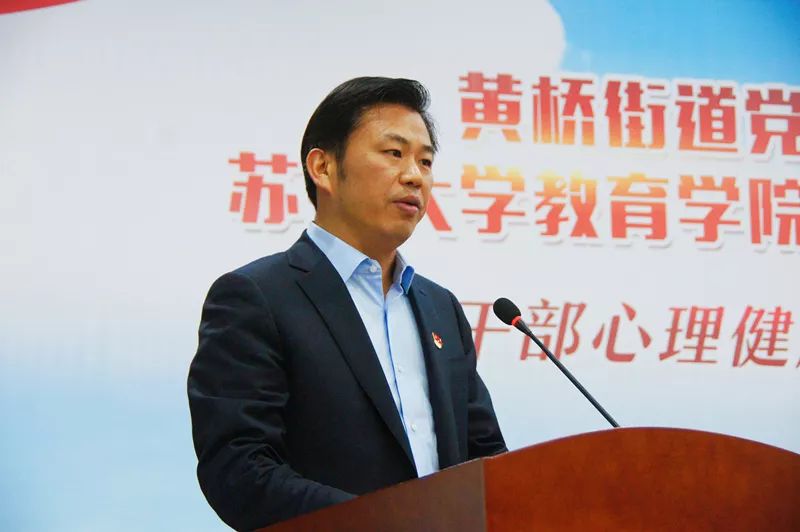 胡玉庆以《党建共建携手浇灌心理关爱的向阳之花》为主题发表讲话。他指出,党建共建能进一步整合地校基层党建资源,拓展和提升合作内涵,实现资源配置优化、组织效能强化;双方联盟能进一步拓展基层党建的工作模式,通过党建共建使基层党建跳出内循环式的工作模式,在功能上实现相互扩展和相互融通;领导干部心理健康关爱“向阳花工程”,能充分发挥小黄书 的师资力量,为黄桥街道打造健康型干部队伍。