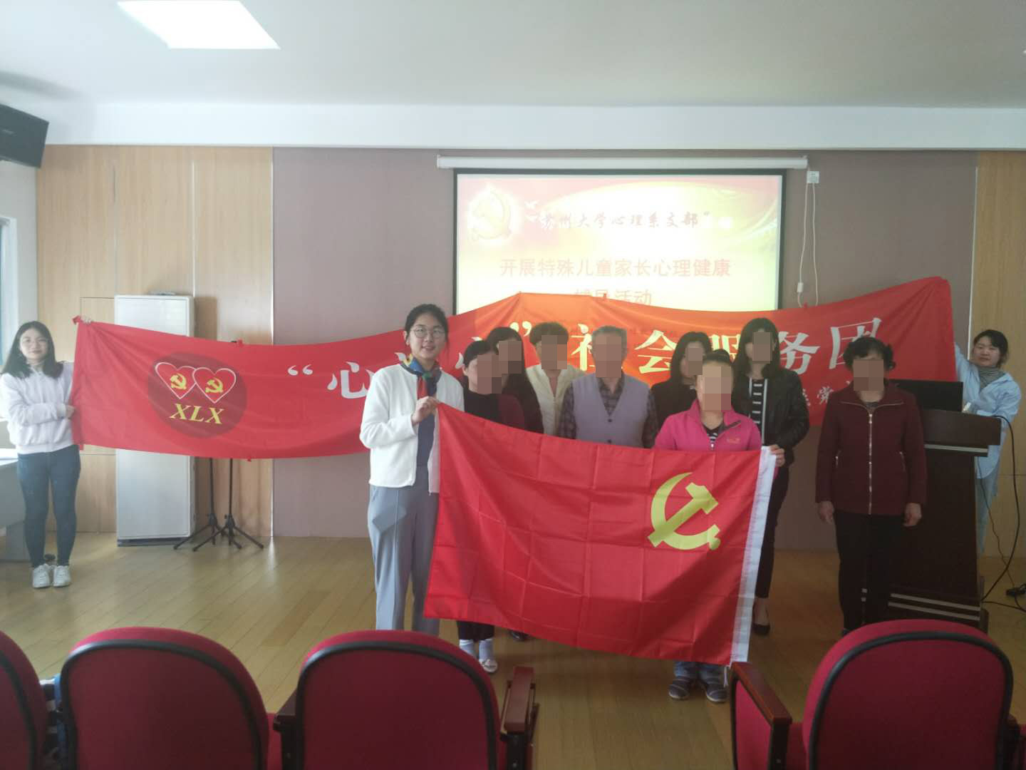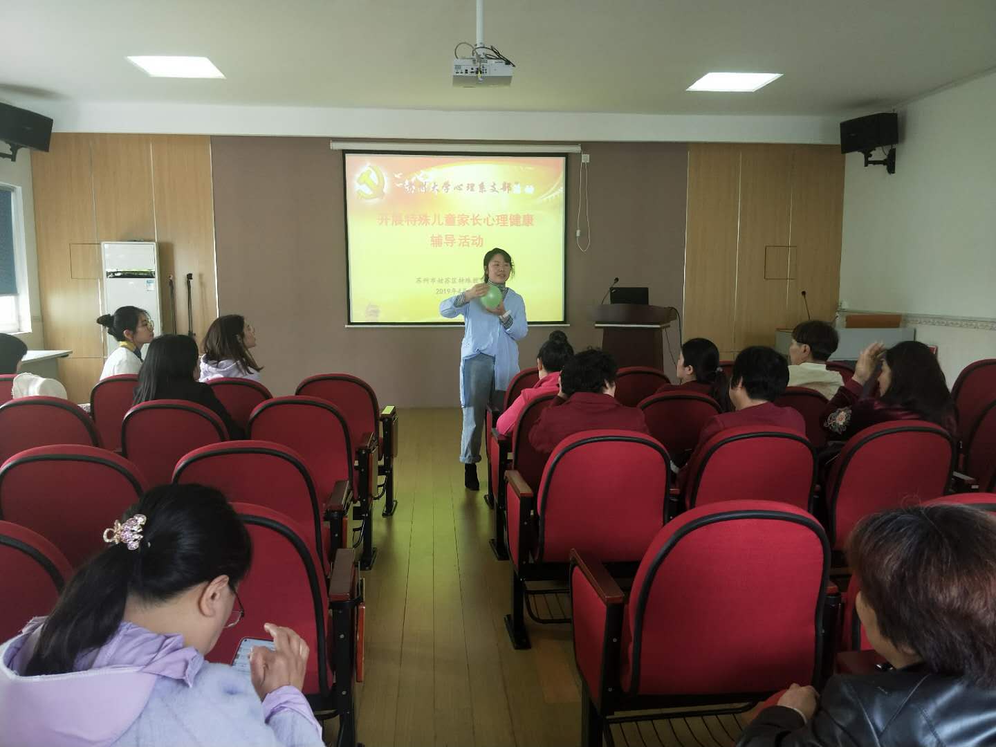 在温馨的多媒体教室中,小黄书 党员黄辛隐教授的研究生团队与该校许多特殊儿童家长就“缓解压力,调整自我”为主题进行交流,帮助家长们纾解内心,放松自己。