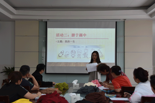 如果将你的一生放在九宫格里,你会怎样描绘它?邱小余研究生请家长们以特殊的顺序将自己的一生用彩笔在手中的九宫格纸上画出来并加以分享。在优美的音乐下,家长们沉思着,陷入或幸福或悲伤的回忆中,现场氛围变得安静而又温暖。随着绘画时间的进行,家长们手中的白纸渐渐被人生的回忆和展望充满。一位奶奶向大家分享了自己的“人生九宫格”,从饿着肚子的童年到劳动的青年时代,从步入婚姻到渐渐衰老,明媚与灰暗的日子从来都是并存的;一位年轻的父亲将稚嫩的儿时和现在工作的烦恼都加入其中,而最后一幅中的门通向未来,还待打开……家长们通过画笔将自己的人生经历和态度表达出来,也在活动中逐渐学会了审视和反思自己。