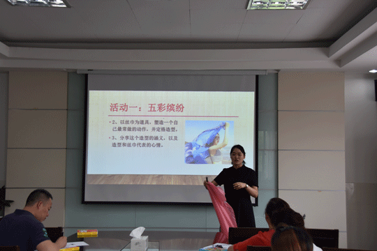表达是人类沟通思想的基础,同时也是释放自身情感的有效方式。研究生宋雪梅带来了各色丝巾,与家长们共同完成“五彩缤纷”游戏。家长们各自选择一种颜色的丝巾并作出造型,向大家分享造型的涵义和代表的心情。一位奶奶选择了孙女最喜欢的粉色丝巾,粉色丝巾让她想到了孙女在家玩“换装”游戏时开心的模样;一位爸爸选择了黄色,因为孩子吃过饭后用黄色毛巾时的表情很幸福……家长们选择各自丝巾颜色的原因很多都与孩子有关,颜色背后的涵义充满了儿童日常琐碎却天真的幸福。其实,比起成年人,孩子表达自己的方式反而更果断和自然。