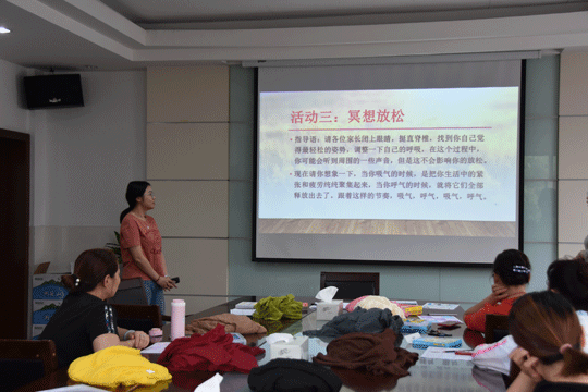 “游于画中”之后,研究生庞文汐带领家长们进行冥想放松活动。在舒缓的音乐下,家长们将身体调整到最舒适的姿势,闭上双眼,给心灵一场放松的旅行……