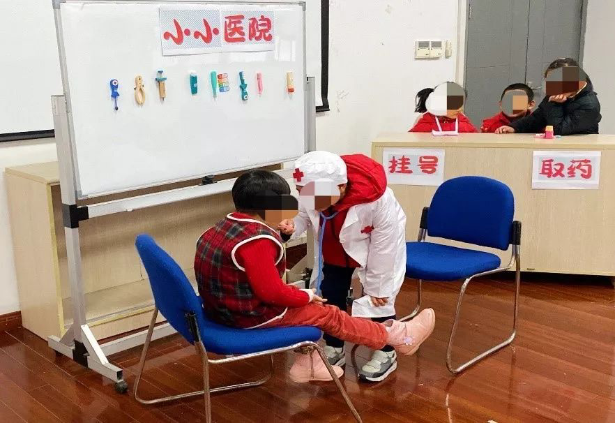 再如,在医院的情境模拟时,扮演挂号处小护士的孩子会耐心询问病人姓名、年龄,给病人做好引导;而我们的“小小医生”则穿上了白大褂、带上听诊器,有模有样地询问病人的症状,给病人做检查、开药;扮演取药处小护士的孩子会仔细核对处方上开的药品,嘱咐病人如何服药;而“病人”会配合医生做检查,全程有礼貌地与医护人员互动。