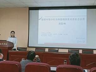 15级应用心理学班的朴雪梅同学答辩的题目是《虚拟环境中化身和情感因素对亲社会行为的影响》。朴同学在答辩中介绍了实验设计和目前的实验进度,并回答了丁芳老师提出的“化身着装是否存在刻板影响而不能完全反映化身的攻击性”问题。