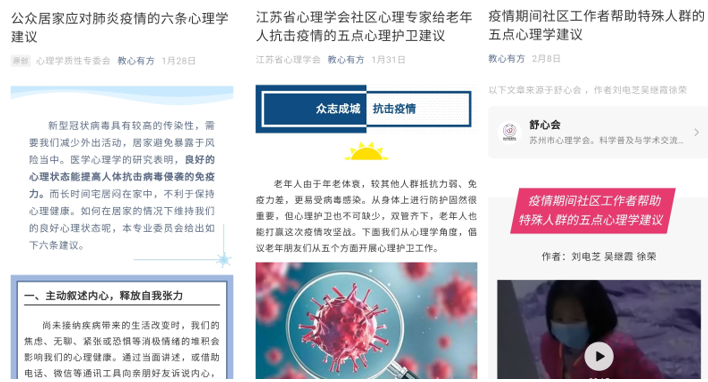刘电芝、吴继霞教授,2月8日参与组织、起草和定稿苏州市心理学会、江苏省社区专委会和中国心理学会质性专委会的《疫情期间社区工作者帮助特殊人群的五点心理学建议》。吴继霞教授,1月31日组织和指导自己的研究生团队在“诚信心世界”公众号上撰写科普文章《关注心理防护,共渡疫情难关》;2月15日《返岗复工后,你可以这样做好四点心理防护》等都达到科普宣传的效果。