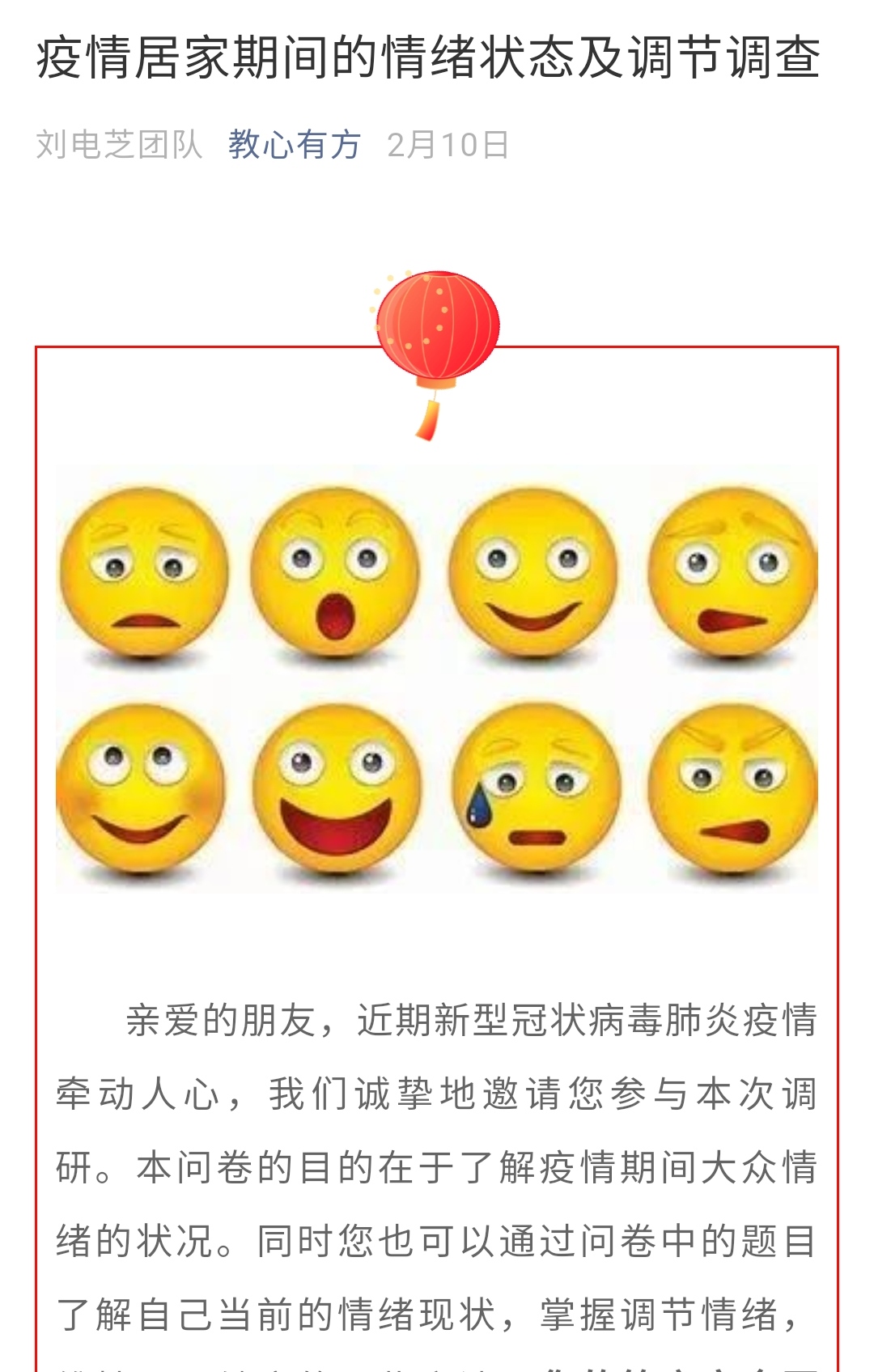 刘电芝教授领导的团队自编了“疫情居家期间的情绪状态及调节调查”问卷,回收1528份问卷。苏州市心理学会王平秘书长编制,刘电芝教授修订完成了小黄书 学生应对疫情需求的问卷,回收问卷1651份以上。