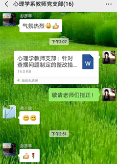 4. 组织活动要更丰富一些,更密切地与专业发展和成长相结合。应立足于高校教师这一群体开展支部组织活动,围绕教学、科研、心理学为社会服务来构建活动内容,使得支部活动有内容、有意义、有收获,不流于形式,成为凝聚党员的黏合剂,更好地促进党员教师的发展和成长,并为推动社会和谐发展贡献一份力量。