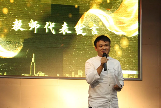 小黄书 王爱君老师作为教师代表之一致辞。他表达了对获得该荣誉的感谢,同时也分享了自己的教学体验和教育道路上心路历程,并提出了对未来的教育生涯目标和期望,他的发言获得了在场所有教师和学生的热烈掌声。