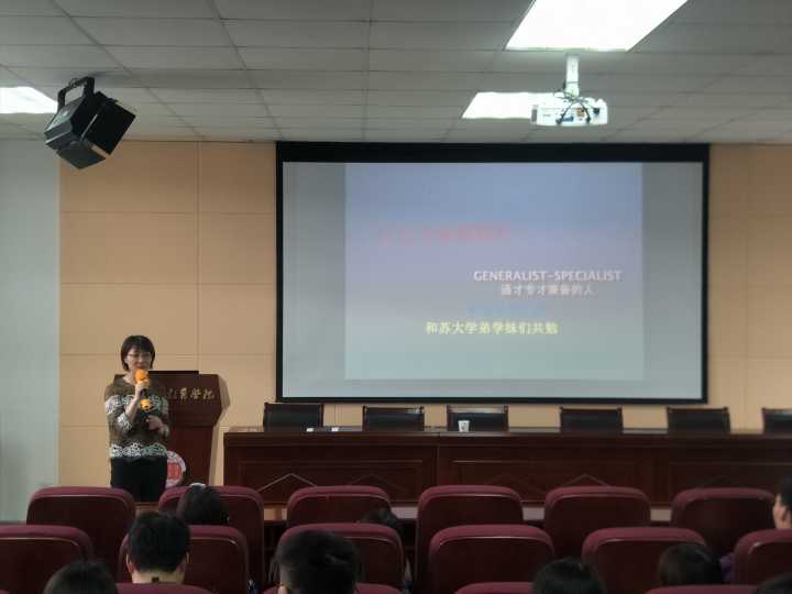 郑莉女士首先从她个人的专业选择、求职经历讲起,讲述了自己的整个职业发展情况。接着,她从求职行业选择、人生规划、固化思维和成长思维的比较等方面分享了自己的观点,在分享过程中,多次援引自己女儿以及身边职场人的故事来加深在座学生对其观点的理解。另外,她还分享了职业发展最重要的1+N个能力,希望在座学生能够在走进职场前加强自己这些方面的能力以提升自己的竞争力。