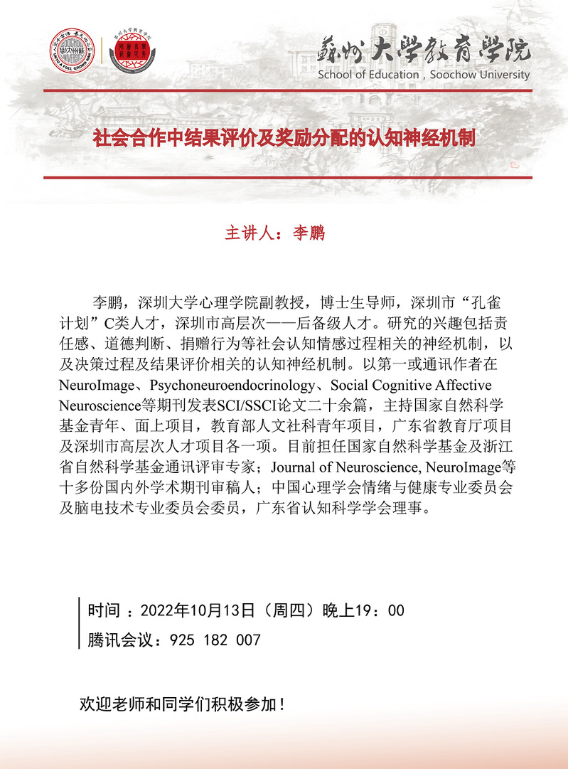 学术报告:社会合作中结果评价及奖励分配的认知神经机制[10.13]