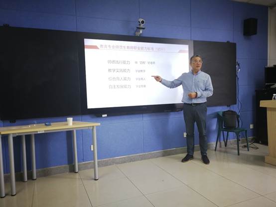 王润清副主任从教育专业师范生教师职业能力标准、教师专业能力分类、师范生教师专业能力储备三个方面对新教师的专业能力进行了全面解读。首先,他从教育部印发的《教育专业师范生教师职业能力标准》出发,阐述了能力标准对教师职业的专业要求,即践行师德、学会教学、学会育人、学会发展,进而分析了教师职业生涯的五个阶段:职前期、适应期、积累期、成熟期、创造期。然后,王主任从“德”和“能”两个维度具体阐释了教师专业能力的内涵,强调了教师专业能力发展的必要性和重要性。最后,他结合实际从师范生以德为先、做好规划和注重积累等三个方面提出了教师专业能力储备的具体建议。