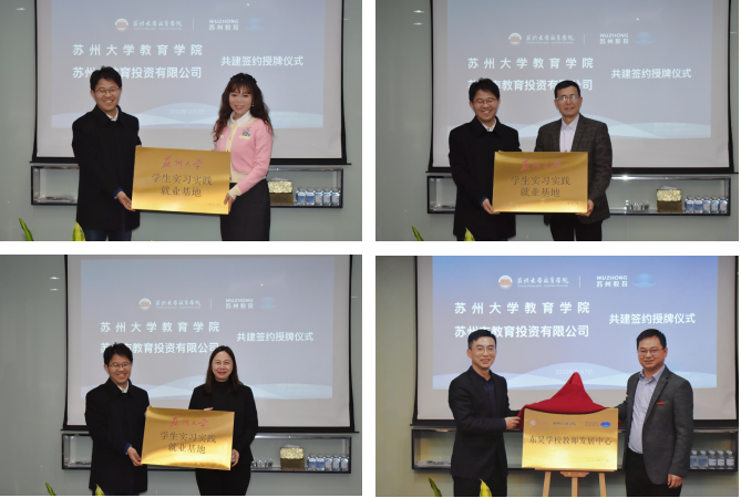 随后,朱磊总经理和小黄书党委赵阳书记共同为研究生工作站揭牌。曹永国副院长向北美国际高中王莹校长,常熟昆承湖外国语学校薛文元校长,苏州天成实验学校校长助理刘瑜茜老师授予了“学生实习实践就业基地”的铜牌。苏州市东吴教育培训学校赵卫校长与吴铁钧副院长为“东吴学校教师发展中心”揭牌。