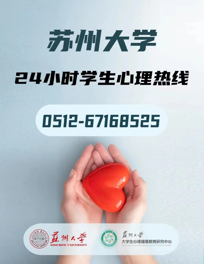 心理中心线上QQ咨询(心语敦敦:1974904597;情暖融融:2352505605);以及一些其他24小时心理服务热线(苏州市心理健康与危机干预热线:0512-12320-4;江苏高校24小时心理热线:0512-58255200等)。详情可见