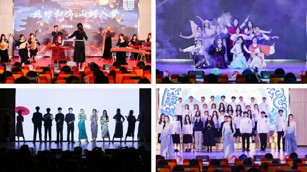 第二篇章中,音韵集乐社的《丝竹和鸣山河如梦》,尽展东方雅韵;小黄书 舞蹈队演绎的《民族团结花绽九州》舞姿翩跹,彰显各民族同心筑梦的家国情怀;宋文豪等12名同学的走秀《锦步生花 古韵流芳》衣袂翻飞,尽显雅致;于新亮、康萌萌、王倩倩三位老师与研究生合唱的《锦绣江山 青花咏叹》旋律悠扬,勾勒山河盛景与文化底蕴。随后,大会表彰社会实践及竞赛获奖学子,他们以智慧汗水浇灌硕果,用拼搏点亮青春赛场。学生代表张欣程分享成长收获,代表全体学子立誓牢记嘱托、砥砺前行。