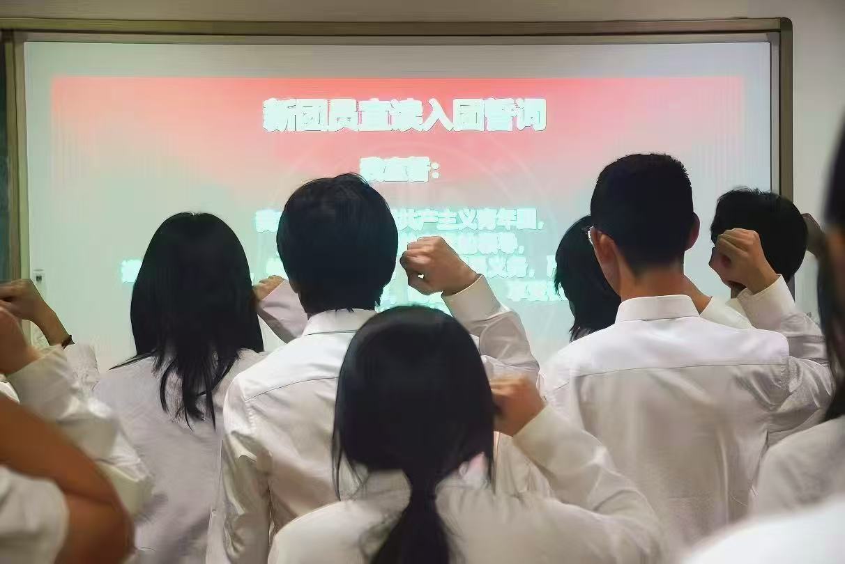仪式在庄严的国歌声中拉开序幕。随后,主持人宣读新发展团员名单,高蕾老师代表学院团委为新团员逐一颁发团员证并佩戴团徽,并在领誓人的带领下,新团员面向鲜红的中国共产主义青年团团旗,举起右拳庄严宣誓。