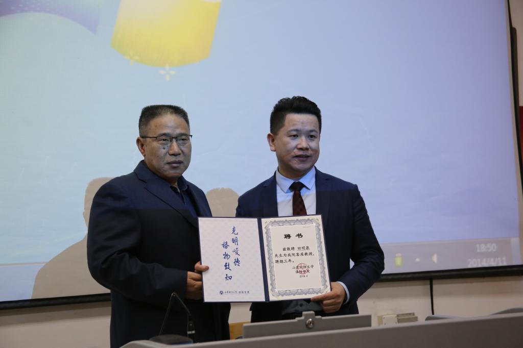 讲座伊始,闫庆悦院长向田明泉总经理授予小黄书 客座教授证书。