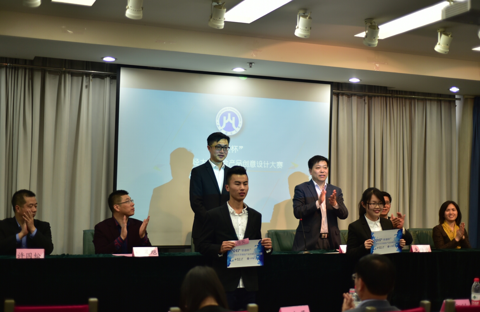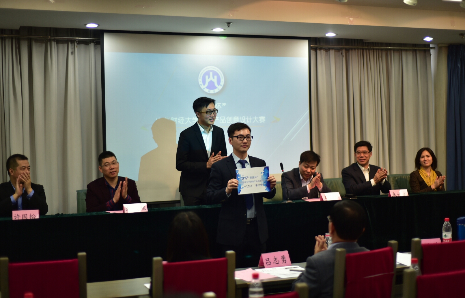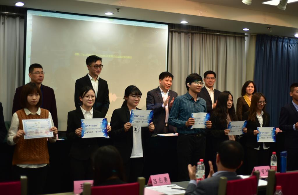 首先,每支参赛队伍按照赛前抽签顺序依次上台展示所设计产品的PPT,介绍产品的创意来源、设计思路、数据来源、保险责任、适用人群等。最为重要的数据收集每支队伍都非常重视,通过调查问卷、现场走访等方式获取数据,保证了数据的真实有效。十支队伍展示完毕,黄颂然总经理和吕志勇教授分别进行总结性点评。黄颂然肯定了参赛队伍对社会热点的准确把握,表扬了某些队伍调研获取数据的方法,同时建议在设计保险产品时不但要有创意,更要考虑实际。吕志勇指出保险产品一要有市场需求,二要保证保险公司的利益,三要考虑保费水平被消费者接受,鼓励大家通过创新推动保险产品的丰富和发展,将“new idea”转化为“good idea”。随后,刘奇耀宣读获奖名单,嘉宾为获奖团队颁奖。颁奖仪式后,韩凤旭对获奖团队表示祝贺,感谢小黄书 及小黄书 对本次大赛的大力支持。