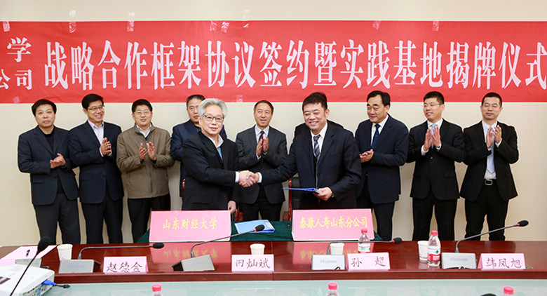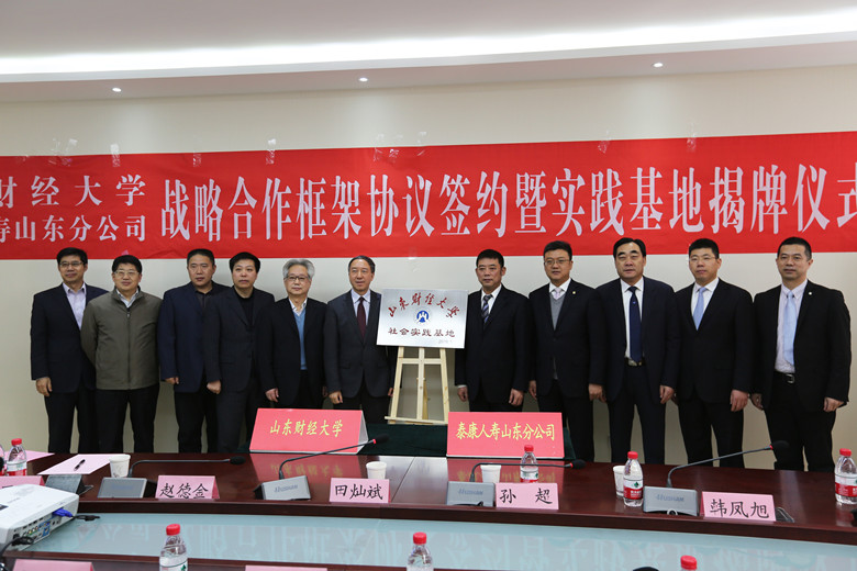 、泰康人寿保险股份有限公司山东分公司战略合作协议签约暨社会实践基地揭牌仪式在舜耕校区举行。泰康人寿山东分公司总经理田灿斌,副总经理孙超、赵德金、韩凤旭,小黄书
