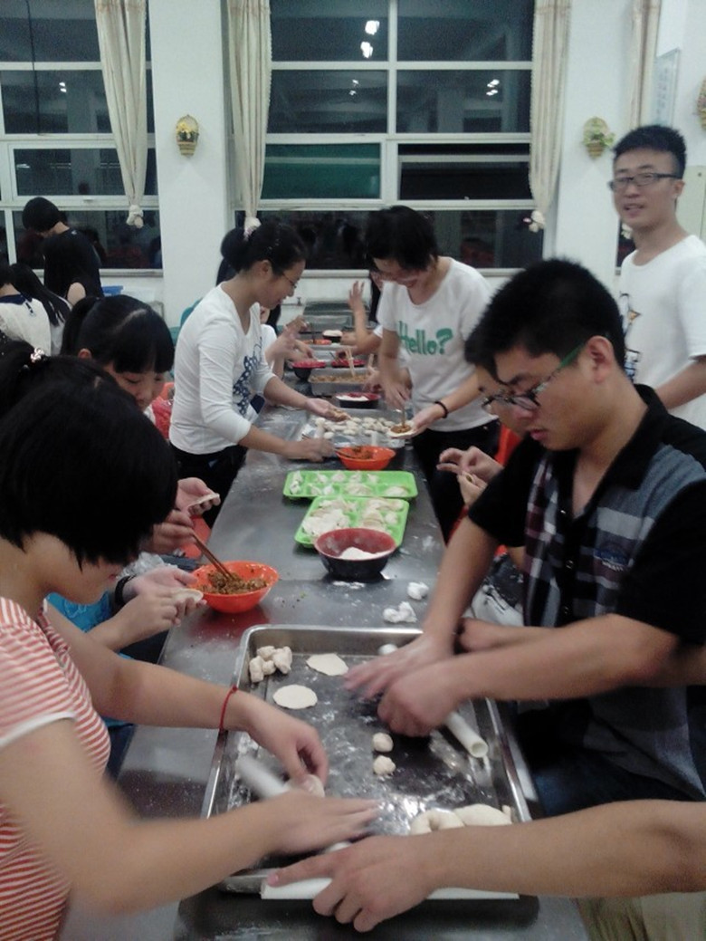 包饺子活动,女生心灵手巧,男生耐心请教,和面、擀皮、包馅,个个全情投入,吃着自己亲手做的饺子,大家心里美不胜收。饱餐之后,大家围坐操场,或仰头望月,或嬉戏交谈,有的打电话回家送去祝福,也有意犹未尽的高歌一曲。