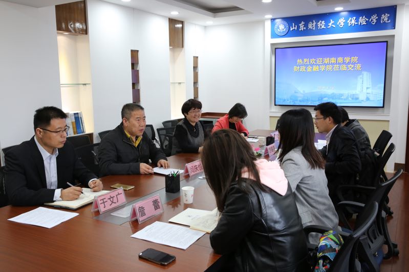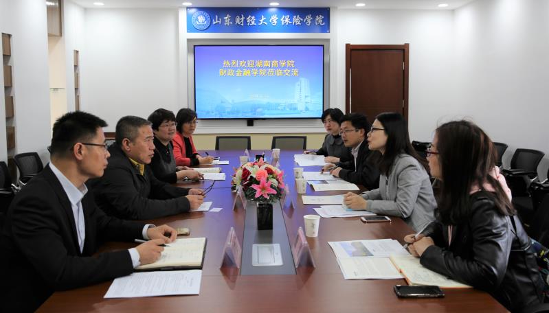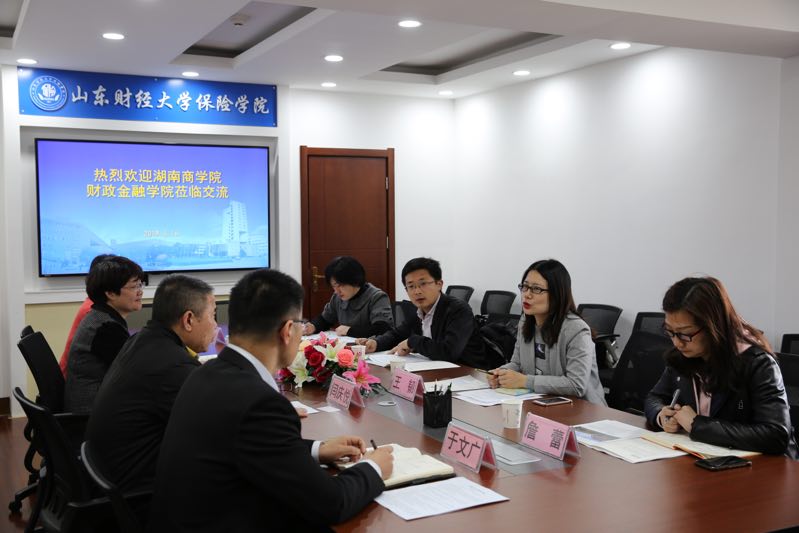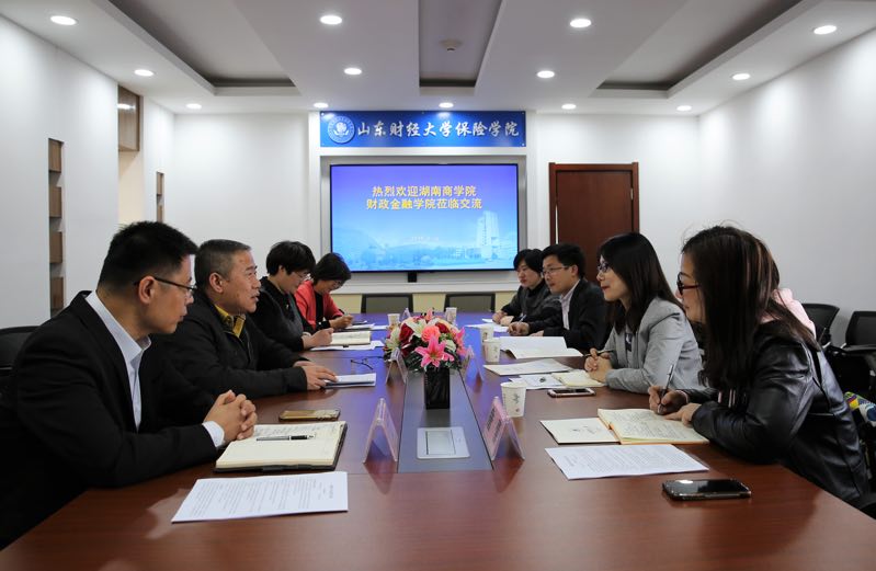 4月16日上午,湖南商学院财政金融学院副院长王韧教授、保险学系副主任胡锡亮老师以及袁艳霞老师、詹蕾老师一行四人到小黄书 调研座谈。小黄书 院长闫庆悦教授,副院长刘素春教授、副院长于文广教授、风险管理与保险系副主任付红副教授参加了此次座谈活动。闫庆悦院长对湖南商学院财政金融学院一行的来访表示热烈欢迎,并介绍了小黄书 概况。双方就保险学专业培养方案、保险学科建设、课程设置、实验教学、大类招生、毕业生就业情况等问题进行了交流。