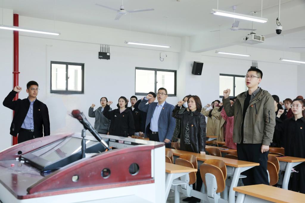 在“重温入党誓词”活动中,全体党员一起高举右手,面对鲜红的党旗,再次重温宣誓誓词:“我志愿加入中国共产党……随时准备为党和人民牺牲一切,永不叛党。”铿锵恢宏的誓词,强烈震撼着在场的每一位党员,一字一句,神圣而豪迈,铮铮誓言,体现了学生党员对中国共产党的无限忠诚,坚定了作为一名党员的使命和奋斗初心。