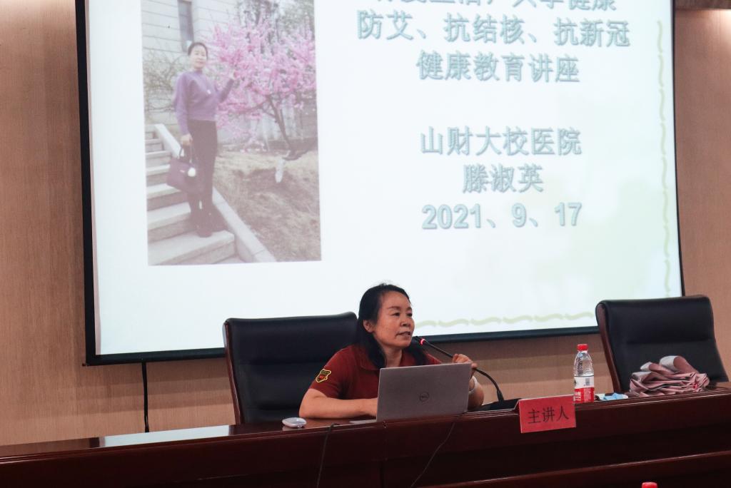 专题四,防艾、抗结核、抗新冠健康教育。防艾、抗结核、抗新冠健康教育专题由我校校医院的滕淑英院长主讲,她向同学们重点介绍了新冠肺炎、结核病和艾滋病的防治相关知识。本次讲座为我们介绍了艾滋病、结核病、新冠肺炎的传染源、传播途径、易感人群、临床表现等知识;提出了疫情常态化防控下的应急处理方法和校园常见传染病的防控措施,向我们介绍了如何正确认识校园常见疾病以及日常预防措施。