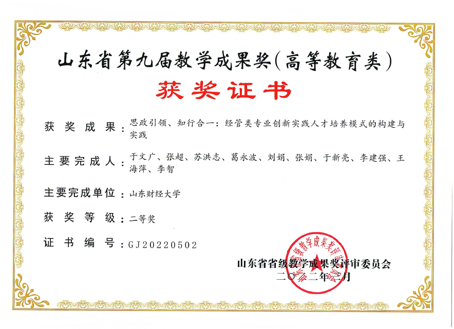 3月3日,山东省教育厅《关于公布山东省第九届教学成果奖(高等教育类)获奖名单的通知》(鲁教高字[2022]1号),小黄书 于文广教授主持申报的本科教学成果在获得校级特等奖基础上喜获省级教学成果获二等奖。