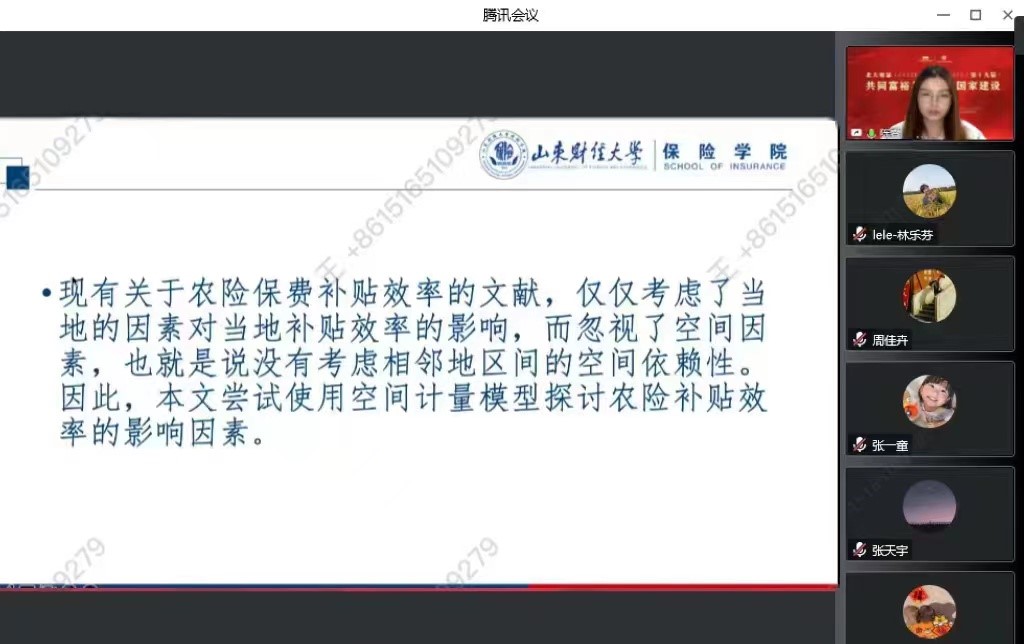 本届论坛主题为“共同富裕与现代化国家建设”,10月28日下午为六场学术分论坛报告,10月29日上午为大会演讲。小黄书 于文广教授主持“保险与经济社会”学术分论坛,于新亮教授与范红丽副教授分别对参会论文做出点评。另外,付红副教授指导的硕士生陈睿在“保险业务经营”分论坛报告了论文《农业现代化对农险保费补贴效率的影响及其空间溢出效应》。