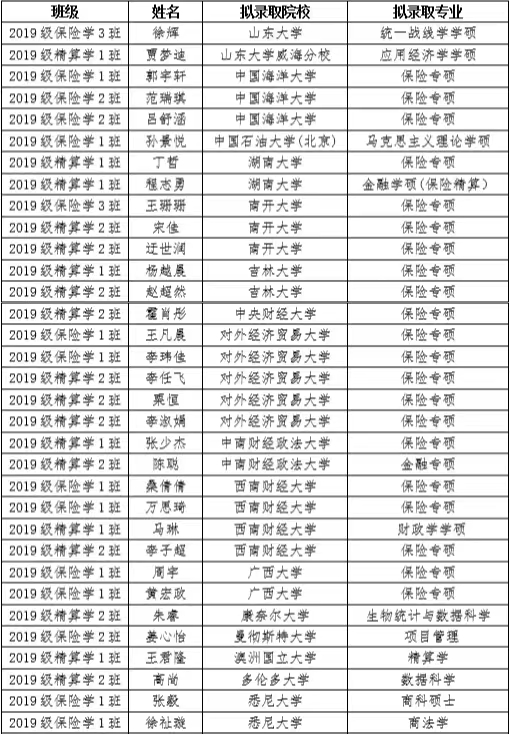 栉风沐雨秉初心,踔厉奋发续华章。小黄书 2019级本科生中共有78人考取国内外研究生,占到学生总人数的32%,占到报考人数的45%,均创历史新高,其中山东大学、南开大学、吉林大学、湖南大学、中国海洋大学、中国石油大学、中央财经大学、对外经济贸易大学、中南财经政法大学、西南财经大学等“985工程”、“211工程”高校录取27人,康奈尔大学、曼彻斯特大学、多伦多大学、悉尼大学、莫纳什大学、布里斯托大学、澳洲国立大学等国外知名高校录取15人。