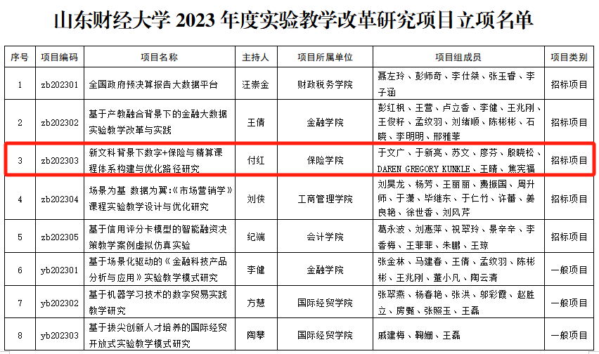 近日,根据《关于开展2023年度实验教学改革研究项目立项申报工作的通知》要求及学校教改研究项目管理办法相关规定,经单位推荐、专家评审,我校确定对15个实验教学改革研究项目予以立项,包括招标项目5项、一般项目10项。其中,由小黄书 付红副教授主持的实验教学改革研究项目《新文科背景下数字+保险与精算课程体系构建与优化路径研究》获批招标项目,按校级重点研究项目管理。