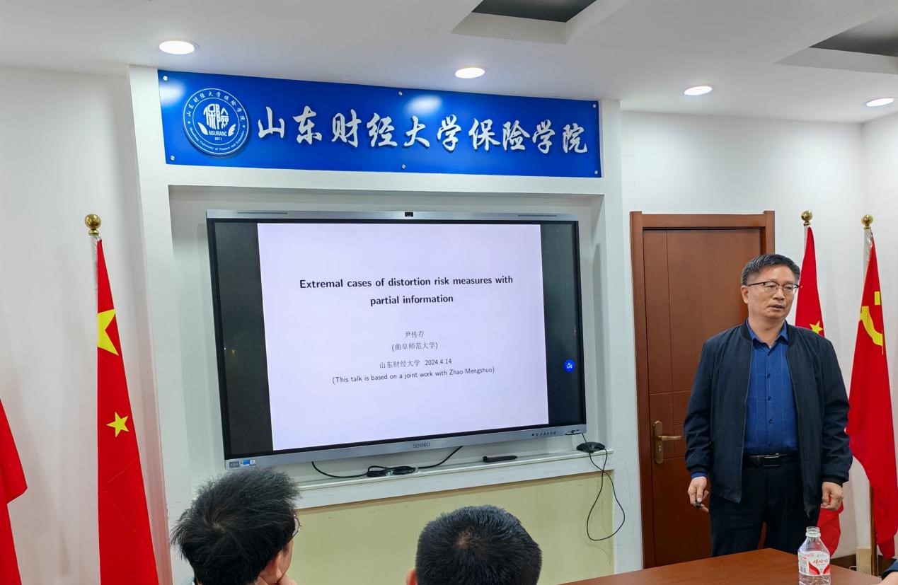 报告下半场由于文广主持,尹传存做了主题为《Extremal cases of distortion risk measures with partial information》的学术报告。尹教授提到在风险管理研究中,如何在只有关于潜在风险因素的部分信息时,使用失真风险度量来评估风险的极端情况,并探讨了失真风险措施的最佳和最坏情况,以及这些极端情况对风险管理决策的影响,如何在实际应用中处理部分信息带来的挑战。
