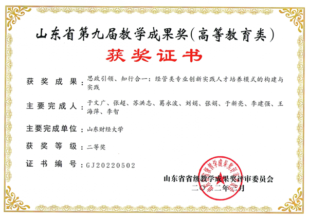 通过该计划的实施,于文广教授及其团队在教学方面取得了丰富的研究成果。2017年于文广教授主持申报的教学成果《基于P7特色实践创新教学模式的财经类高校应用型人才培养的改革与探索》荣获小黄书 教学成果一等奖;2020年主持申报的教学成果《一流专业建设背景下本科生创新型人才培养质量提升研究》荣获小黄书 教学成果特等奖;2022年主持申报的教学成果《思政引领、知行合一:经管类专业创新实践人才培养模式的构建与实践》荣获省级教学成果二等奖;2021年主持山东省本科教学改革研究重点项目:面向新文科的“四融合”学术型创新人才培养模式构建与实践(编号:Z2021161)。发表教改论文《我国高等院校教学科研一体化与创新人才培养研究》和《浅析本科生学术创新型人才培养模式的构建与实践》。