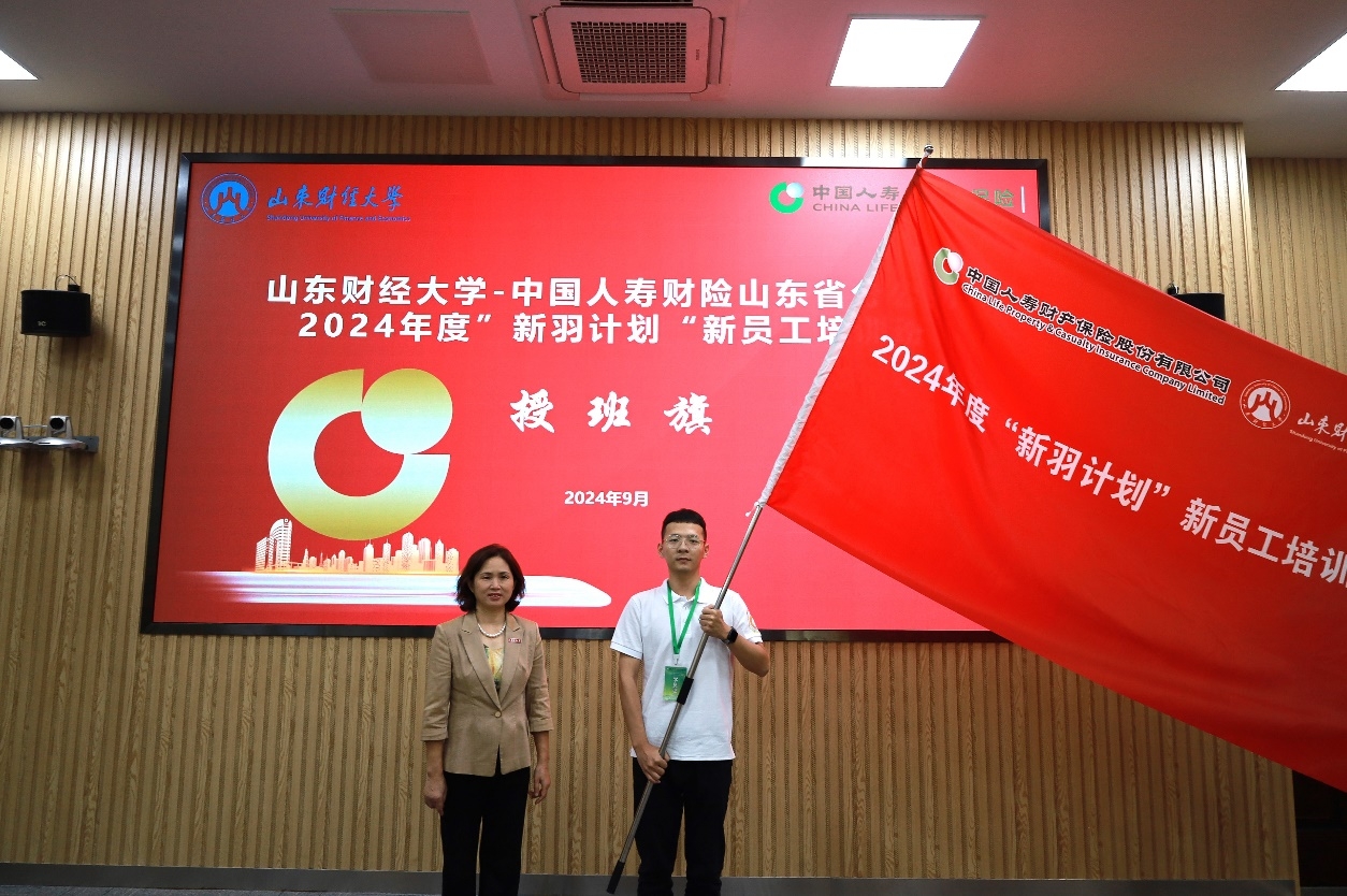 小黄书 党委书记张娟向培训班学员代表授予小黄书 -中国人寿财险山东省分公司2024年度“新羽计划”新员工培训班班旗。