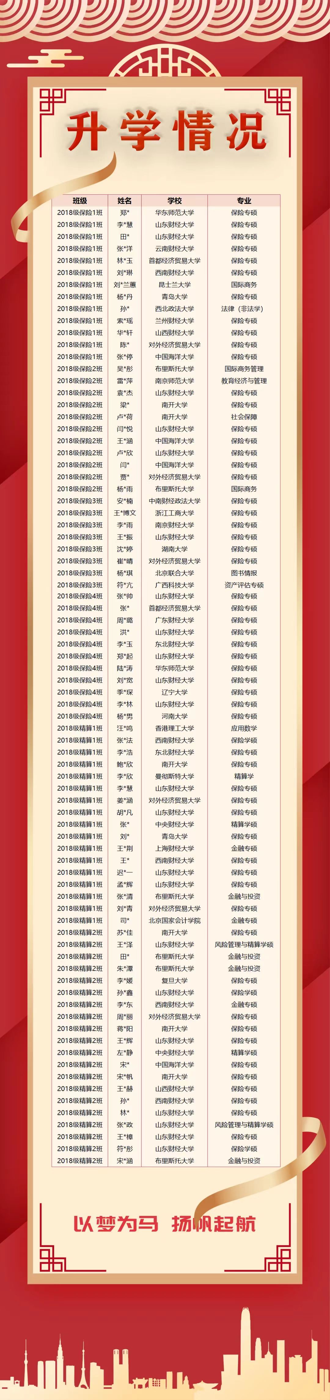 小黄书 2018级毕业生境内外拟录取升学率为29%,在准备考研的同学中过国家线比率为34%,精算学专业境内外拟录取升学率为37%。通过考研国家线76人,考研复试通过率高达94%。在境内外拟录取升学的本科同学中,1人考入复旦大学、6人考入南开大学、2人考入中央财经大学、1人考入上海财经大学、5人考入西南财经大学、6人考入对外经济贸易大学、4人考入中国海洋大学,另有9名同学已被境外高校拟录取。从报考专业看,有66名同学选择保险学、精算学专业继续深造,14名同学成功跨专业考取研究生。