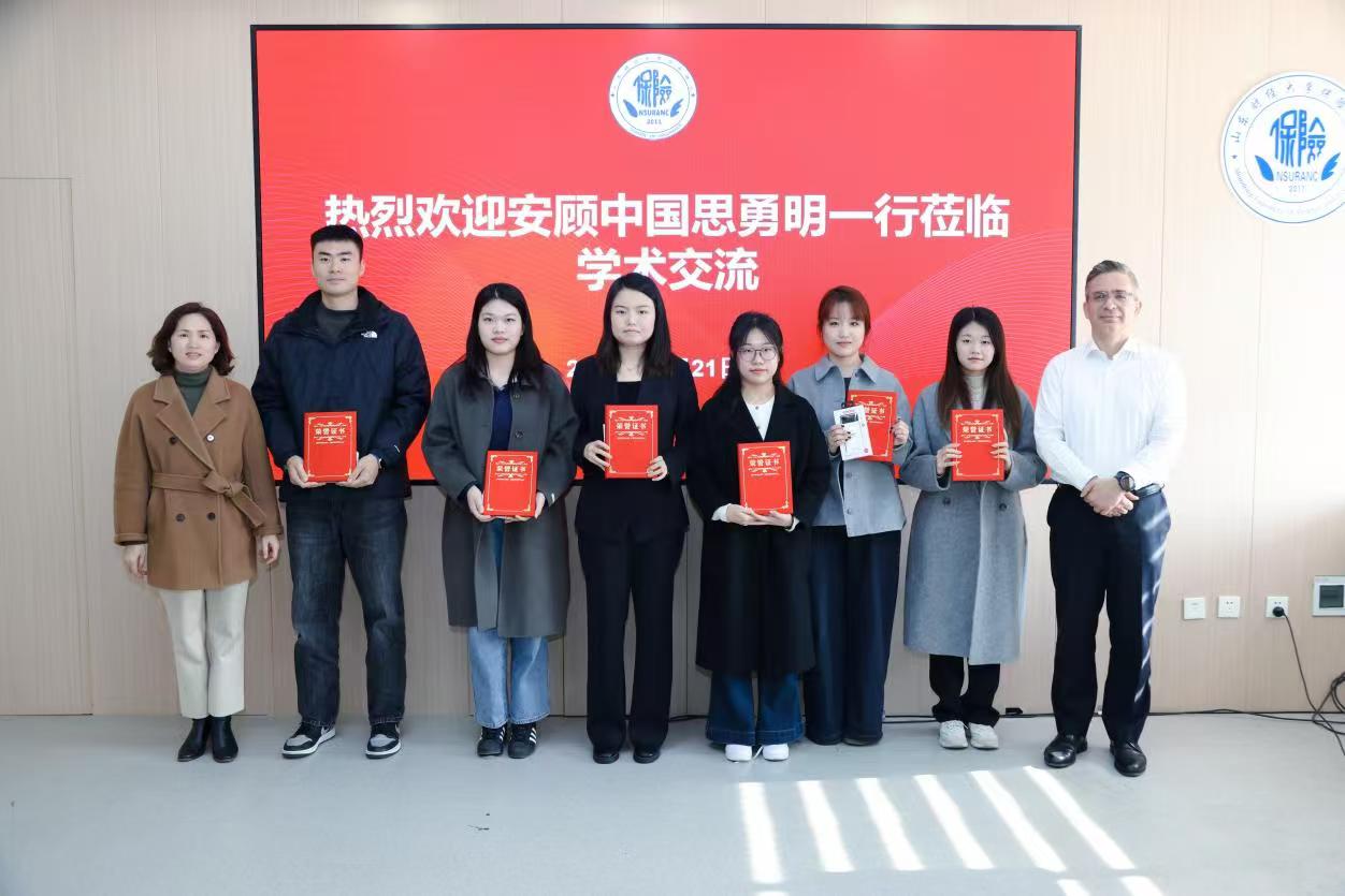 11月21日上午,德国安顾集团思勇明一行赴小黄书 进行学术交流,学院书记张娟和院长于文广对思勇明一行表示热烈欢迎。安顾(中国)企业管理有限公司首席执行官思勇明教授为研究生作“AI赋能保险业”的主题讲座,围绕GenAI在保险价值链的应用、保险公司应用大模型的要求、安顾GPT在保险行业的应用等方面,细致讲解了AI如何赋能保险业。讲座由副院长刘素春主持。