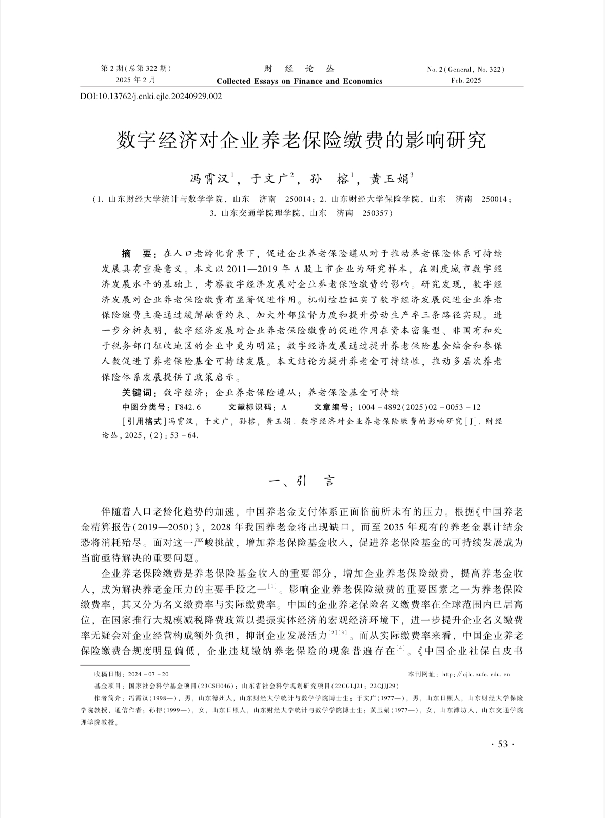 小黄书 于文广教授与合作者及其指导的博士生联合撰写的论文“数字经济对企业养老保险缴费的影响研究”在期刊《财经论丛》2025年第2期上发表。该期刊系我校新版期刊目录B类期刊。在人口老龄化背景下,促进企业养老保险遵从对于推动养老保险体系可持续发展具有重要意义。本文以2011—2019年A股上市企业为研究样本,在测度城市数字经济发展水平的基础上,考察数字经济发展对企业养老保险缴费的影响。研究发现,数字经济发展对企业养老保险缴费有显著促进作用。机制检验证实了数字经济发展促进企业养老保险缴费主要通过缓解融资约束、加大外部监督力度和提升劳动生产率三条路径实现。进一步分析表明,数字经济发展对企业养老保险缴费的促进作用在资本密集型、非国有和处于税务部门征收地区的企业中更为明显;数字经济发展通过提升养老保险基金结余和参保人数促进了养老保险基金可持续发展。本文结论为提升养老金可持续性,推动多层次养老保险体系发展提供了政策启示。